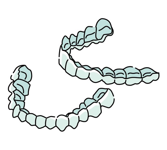 歯科医院では一般的にはスプリント(マウスピース)による治療を行います。これは上顎あるいは下顎の歯列に被せるプラスチックの装置です。これを夜間睡眠中に使用することで、夜間の無意識かみこみで生じる顎関節や筋肉への負担を軽減させます。(保険適応で3割負担の方で約3000円です)