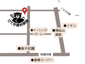 南環状線、味千ラーメンの角を北に300m。株式会社エヒメ医療器の手前にあります。